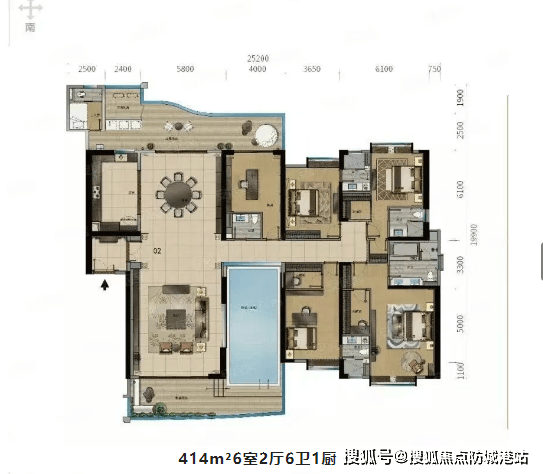 3. 建面586㎡空中泳池复式:9室3厅8卫1厨设计,即将盛大加推,是项目的顶级户型。复式结构设计,上下两层空间独立,功能分区明确,一层以公共区域为主,涵盖客厅、餐厅、厨房、休闲区等,二层以私密区域为主,涵盖卧室、书房、衣帽间等;客厅挑高约4米,搭配超大景观落地窗,采光与视野极佳,空中泳池设计更是点睛之笔,彰显顶级豪宅的品质;多个卧室均为套房设计,满足大家庭的居住需求,每一个空间都经过精心设计,兼顾实用性与舒适性。