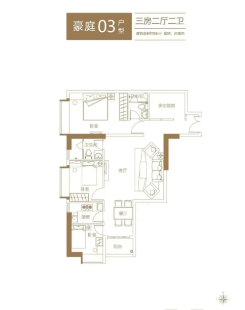 豪庭户型以刚需和刚改为主,面积段为85-191㎡,具体包括85㎡两居、91㎡三居、98㎡三居、108㎡三居、115㎡三居、129㎡四居、145㎡四居、191㎡四居等多种户型。其中,91㎡三居户型备受刚需群体青睐,该户型格局方正,南北通透,客厅连接观景阳台,采光通风效果极佳;卧室均配备飘窗,增加了空间利用率和采光面;厨房采用U型设计,操作空间充足,且临近餐厅,用餐便捷。129㎡四居户型则适合改善家庭,户型布局合理,动静分区明确,客厅宽敞明亮,主卧配备独立卫生间和衣帽间,提升了居住私密性和舒适度。